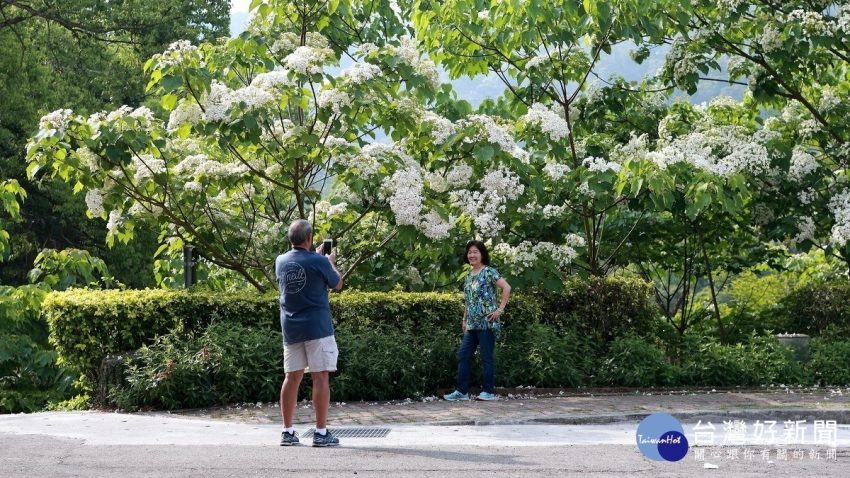 圖說:油桐樹的樹梢上佈滿了雪白的花朵,成為民眾拍照、打卡最美的背景。 東勢林場遊樂區「夏」雪了? 處處可見白色…