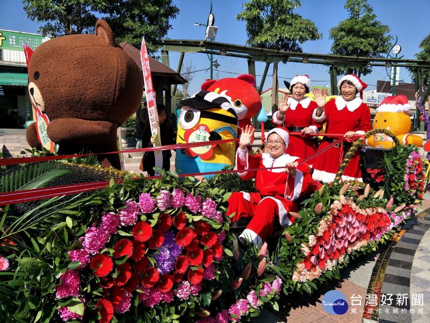 彰化縣長魏明谷(前)在田尾叮叮噹!聖誕幸福你最紅踩街活動前夕,裝扮聖誕老公公駕著花卉雪車,為活動宣傳。圖/記者…
