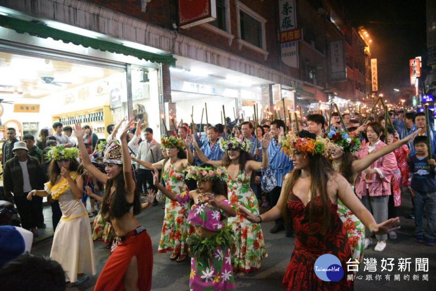南投溫泉季-信義鄉「玉山戀、東埔情」活動,森巴鼓隊及妖怪村等表演團隊引導嘉賓及民眾穿浴衣、持火把繞行東埔大街,…