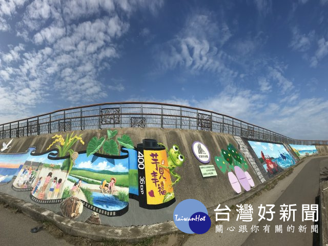 台中市大甲「匠師的故鄉」休閒農業區旁西勢海堤堤防,彩繪師張住在耗時2個月時間,完成美極的打開遇(芋)見幸福等彩…