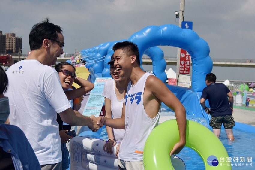 全國首創結合橋樑自行車牽引道設置大型滑水道的新北市「新月水道節」,12日由市長朱立倫主持開幕。(圖/記者黃村杉…