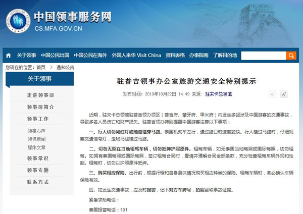 外交部領事司10月22日發布消息稱:近期,駐宋卡總領館駐普吉領辦領區(普吉府、攀牙府、甲米府)內發生多起涉…