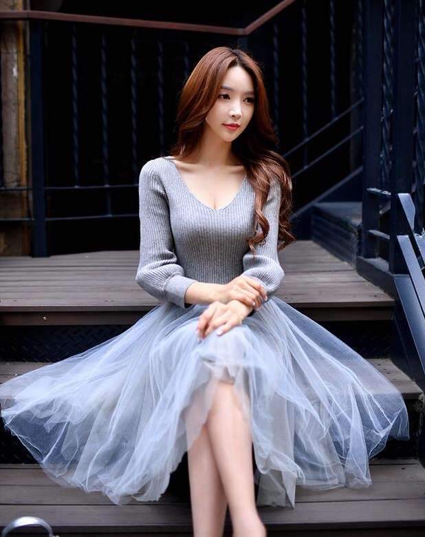 朴秀妍展示一款時尚針織拼接連衣裙