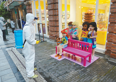 3月29日傍晚,在武漢市楚河漢街商業區,消毒員正在進行最後的街面消毒工作。 隨着復工復產…
