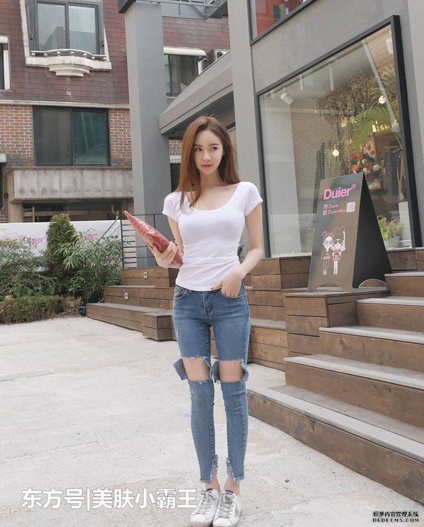 純白體恤搭配淺藍色牛仔長褲 我們可以看到圖中的小姐姐上身穿了一件純白色的t恤,t恤的領口採用了圓潤的設計小姐姐…
