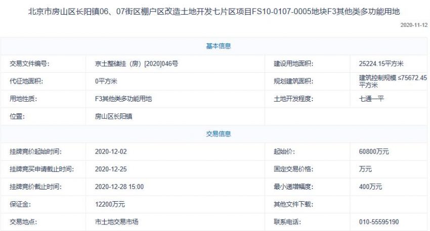 北投新城聯合體6.08億元競得北京房山1宗多功能用地