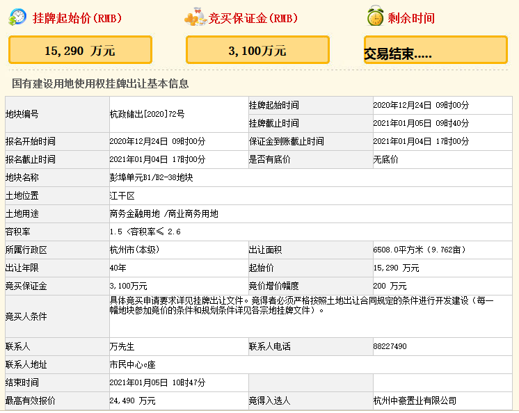 中豪控股集團2.449億元競得杭州市江干區一宗商業用地
