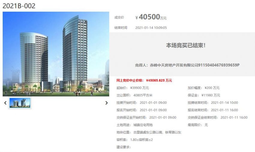赤峰中天地產4.05億元競得蘇州1宗住宅用地 溢價率1.50%