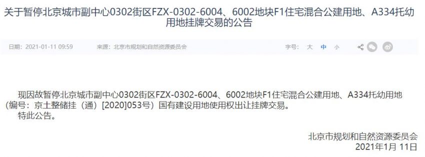 中國網地產訊 1月11日,北京市規劃和自然資源委員會發布關於暫停北京城市副中心0302街區FZX-0302-6…