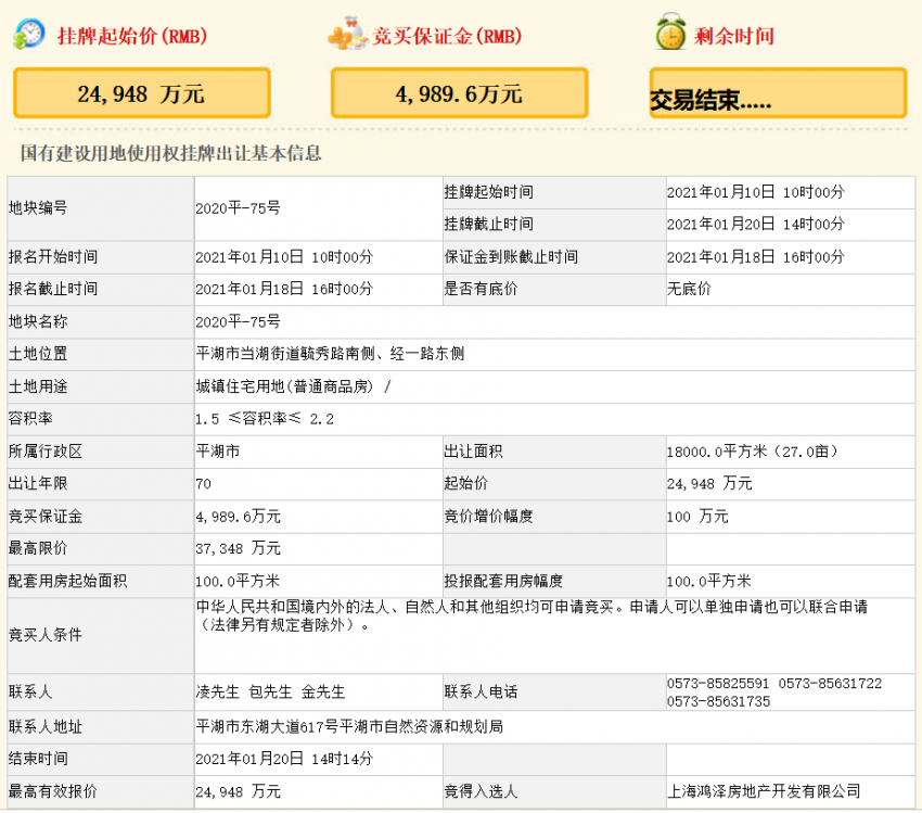 嘉興平湖市12.05億元出讓2宗住宅用地 卓越、新城各得一宗
