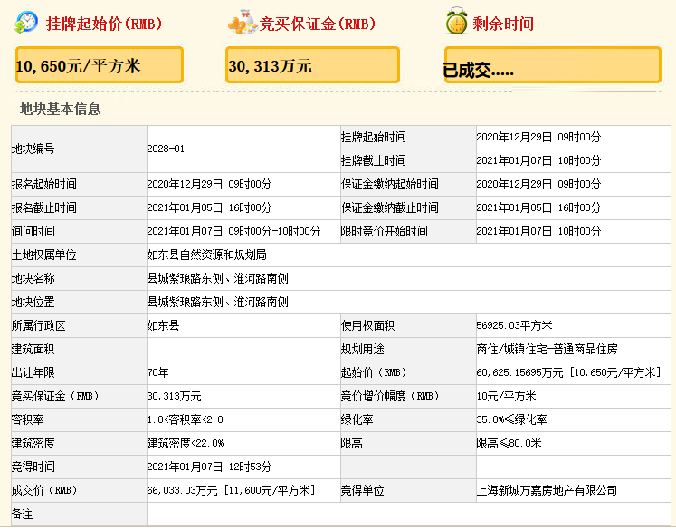 新城控股6.6億元競得南通市如東縣一宗商住用地 溢價率8.92%