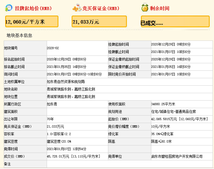 碧桂園4.57億元競得南通市如東縣一宗住宅用地 溢價率8.71%