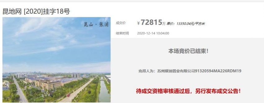 上坤7.28億元競得蘇州崑山1宗住宅用地
