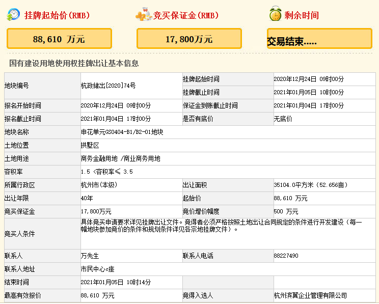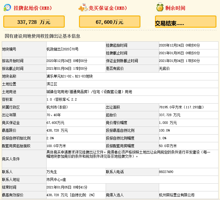 榮盛43.87億元競得杭州市濱江區一宗住宅用地 溢價29.91% 競自持2%