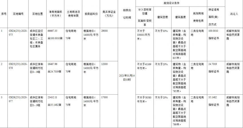 中國網地產訊 1月14日,成都3宗地塊集中出讓,總出讓面積159.85畝。 最終人居以16000元/㎡競得CH…