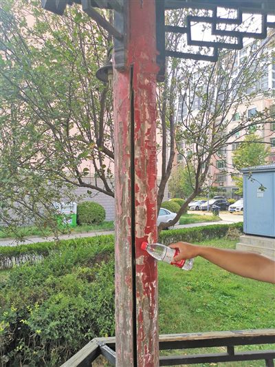 小區內的涼亭支柱已出現較大裂縫。新京報記者 張建 攝 居民家的屋頂有漏水痕迹。受訪者供圖 可撥打報…